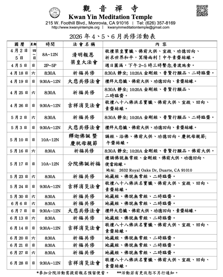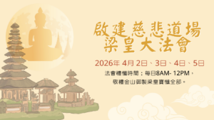 一、 本寺謹訂於 2026年 4月 2日起,(4月 2、3、4、5日)啟建慈悲道場梁皇法會,以此功德祈求:世界和平,人民安樂,佛日增輝,法輪常轉!