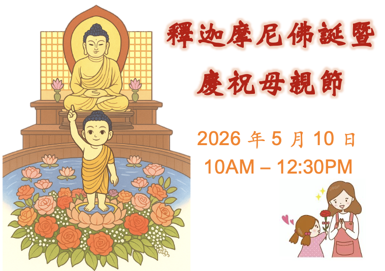 欣逢佛曆2570年釋迦牟尼佛誕,本寺訂於5月10日(星期日),上午10:00起,舉行浴佛大法會,誦持般若心經,唱浴佛偈,祈求諸佛菩薩降臨道場,接受大眾列隊沐浴,虔誠供養。